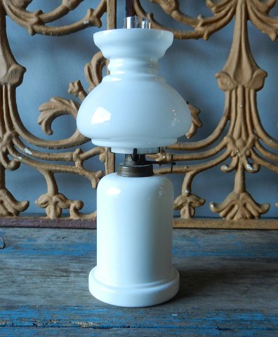 Lille opaline olielampe fra Fyens glasværk. Fremstår med kanthak på brændings glasset.