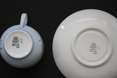 Text available in Danish: Bing & Grøndahl, Demeter Kornblomst) med blå tone, kaffekop med underkop. Dek.nr. 102. Højde 6 cm. I. sortering. Pris: 125 kr. stk. Lager: 12+
