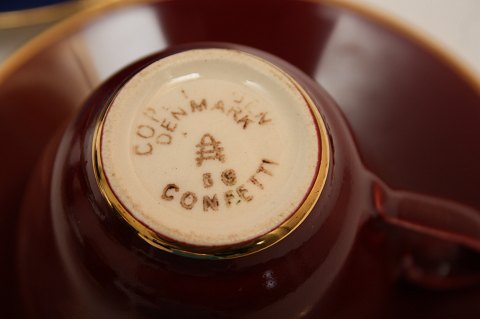 Aluminia, Confetti mokkakopper med guld. Produceret fra 1956-67. Pris: 150 kr. stk.