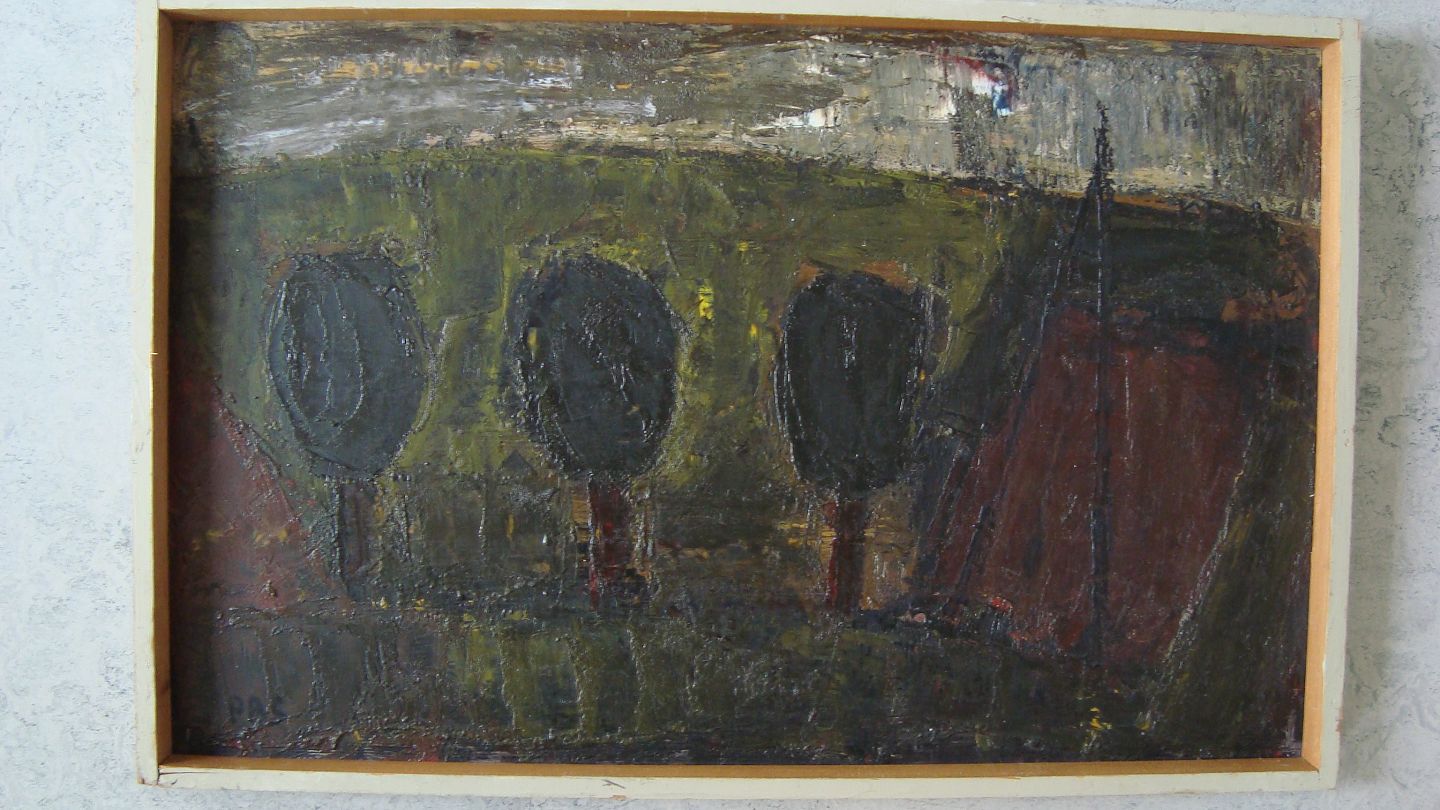 Maleri af Peder Brøndum Sørensen - vej med træer og telefonmast.