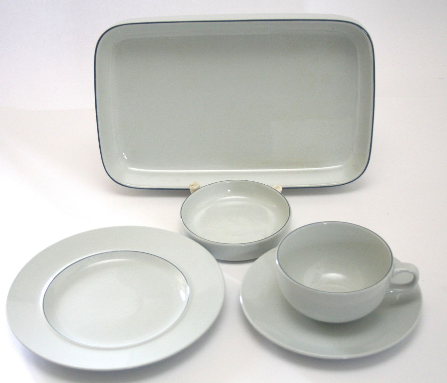 Text available in Danish: Blåkant, Aluminia, designet af Grethe Meyer. Alle med overfladekrakeleringer.