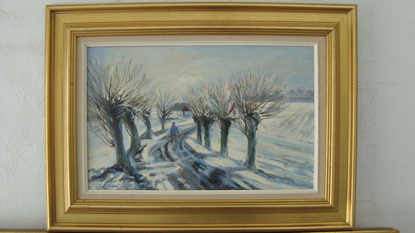 Maleri af Chr. Dybdal - Vinterparti med person på vej.