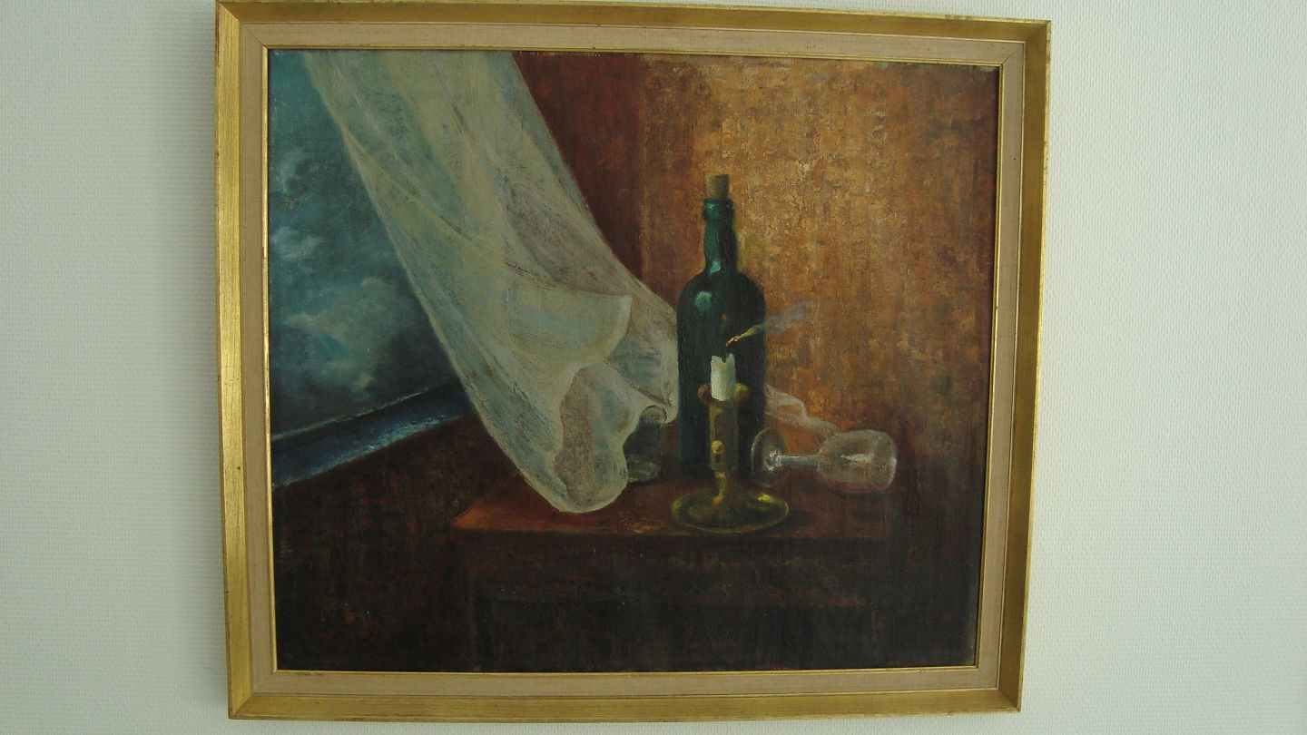 Opstilling på bord ved blafrende gardiner 1963.