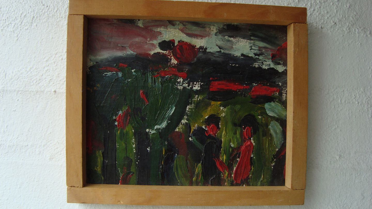 Maleri af Peder Brøndum Sørensen - Landskab med træer og personer.