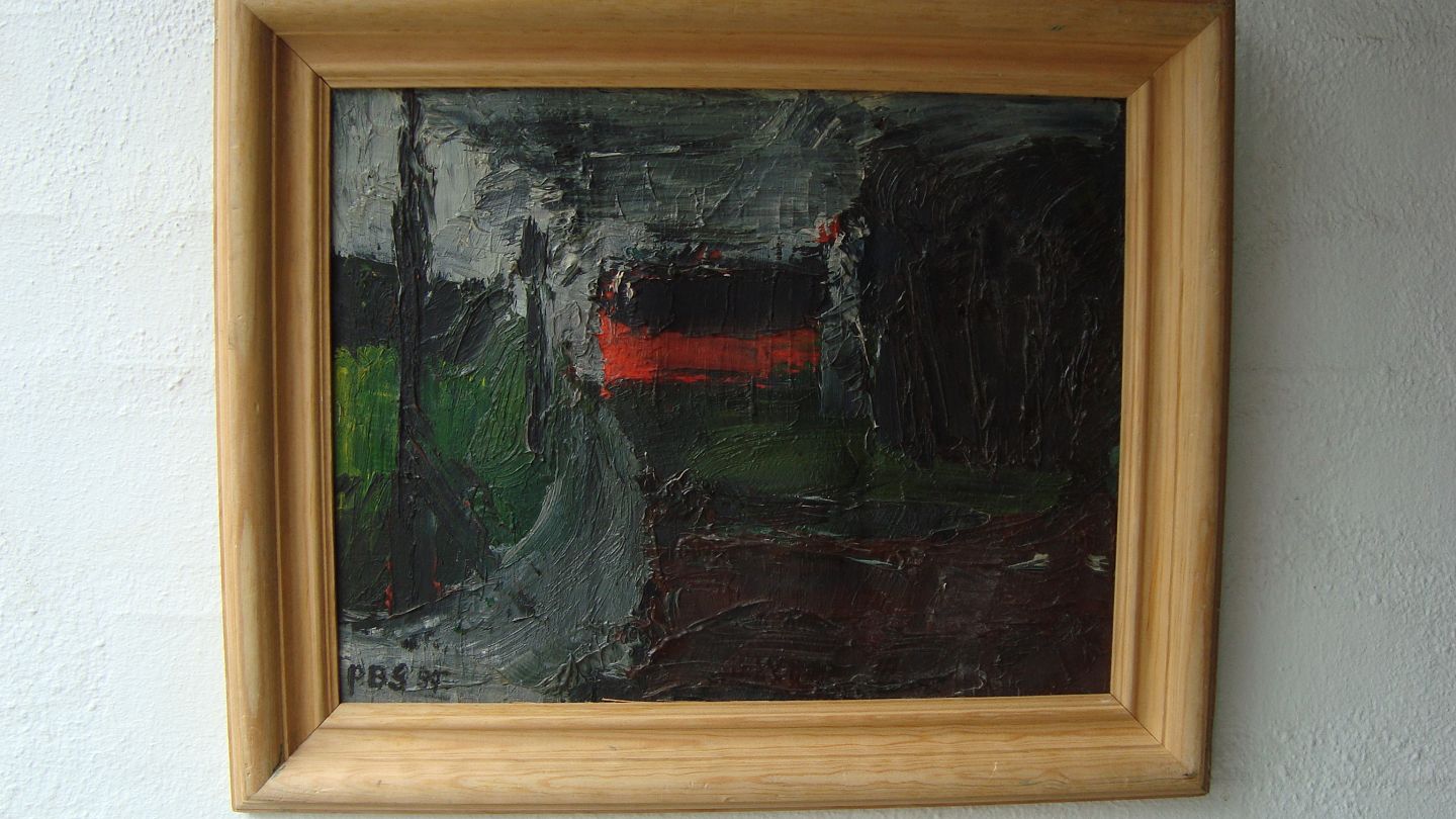 Maleri af Peder Brøndum Sørensen - Landskab med gård 1959.
