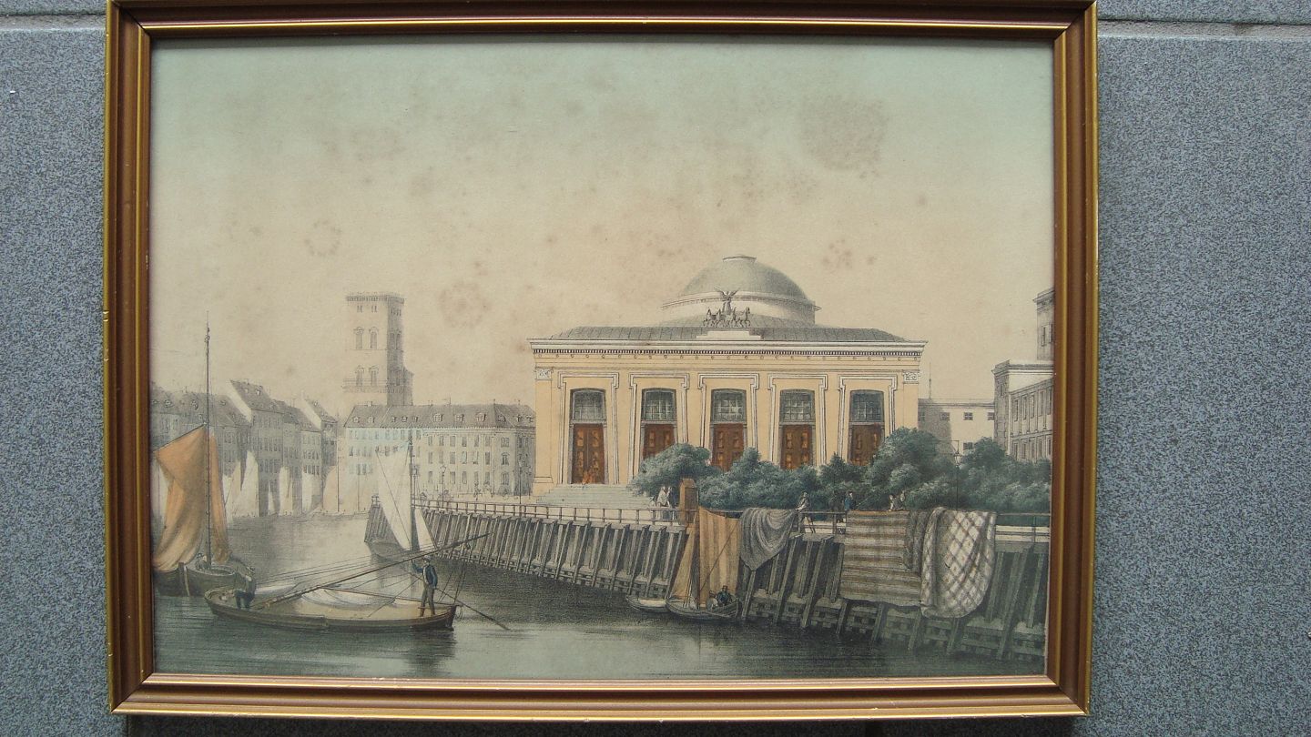 Prospekt af Thorvaldsens Museum (opført 1848), C.F. Hansens Christiansborg (før branden) samt Sankt Nikolaj Kirke (før spiret i 1909) set fra Stormbroen.