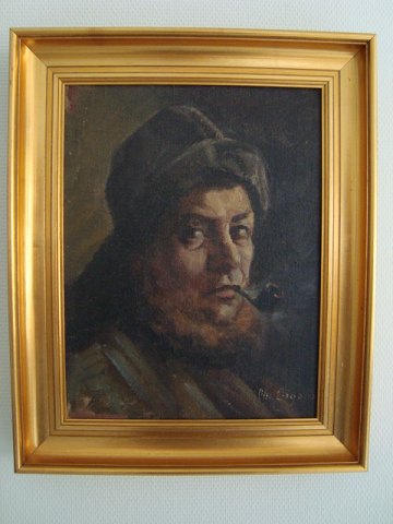 Maleri af Chr. Aigens - Portræt af piberygende fisker.