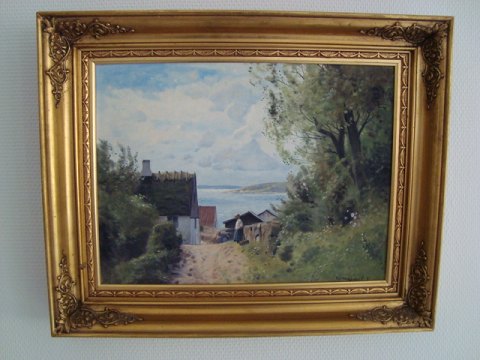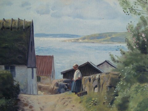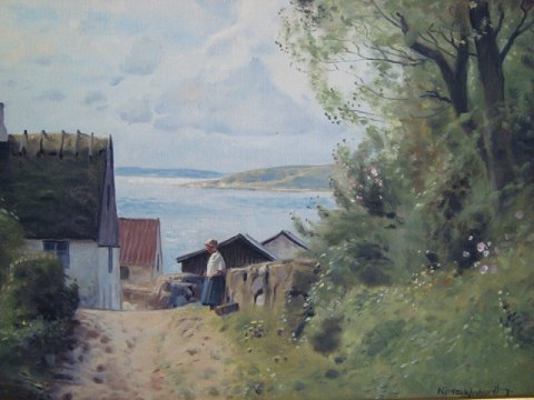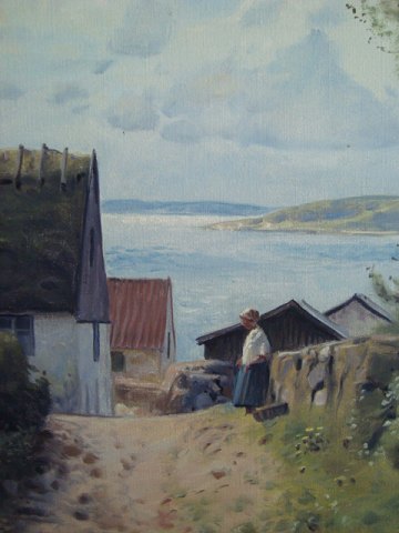 Maleri af Niels Walseth - Sjællandsk kystparti med pige ved fiskerhus.