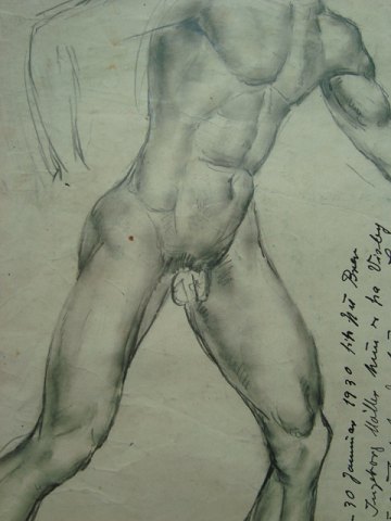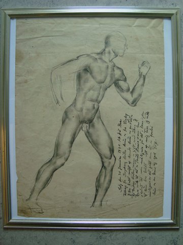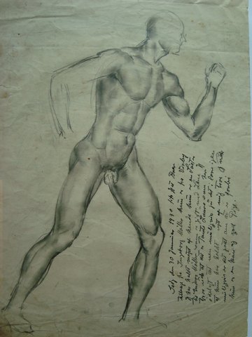 Nøgen, stående, mandlig croquismodel.