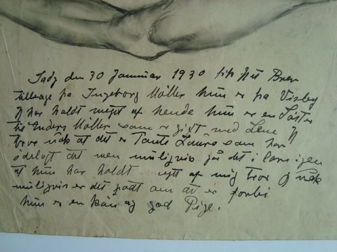 Tegningen er påført skrift om PN's ulykkelige kærlighed til en vis frøken Ingeborg Møller - dateret 30. januar 1930 (se foto).