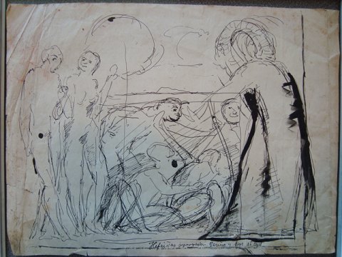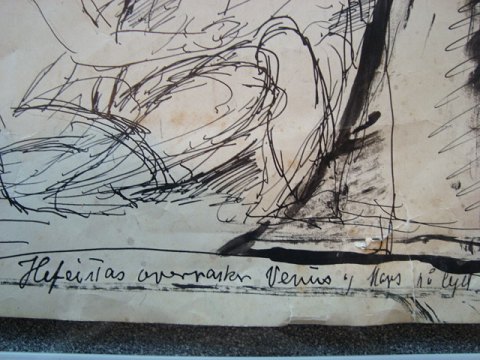 Bagpå tegningen anden tegning af PN i tusch med titlen "Hefaistos overrasker Venus og Mars på lejet" - også usigneret.
