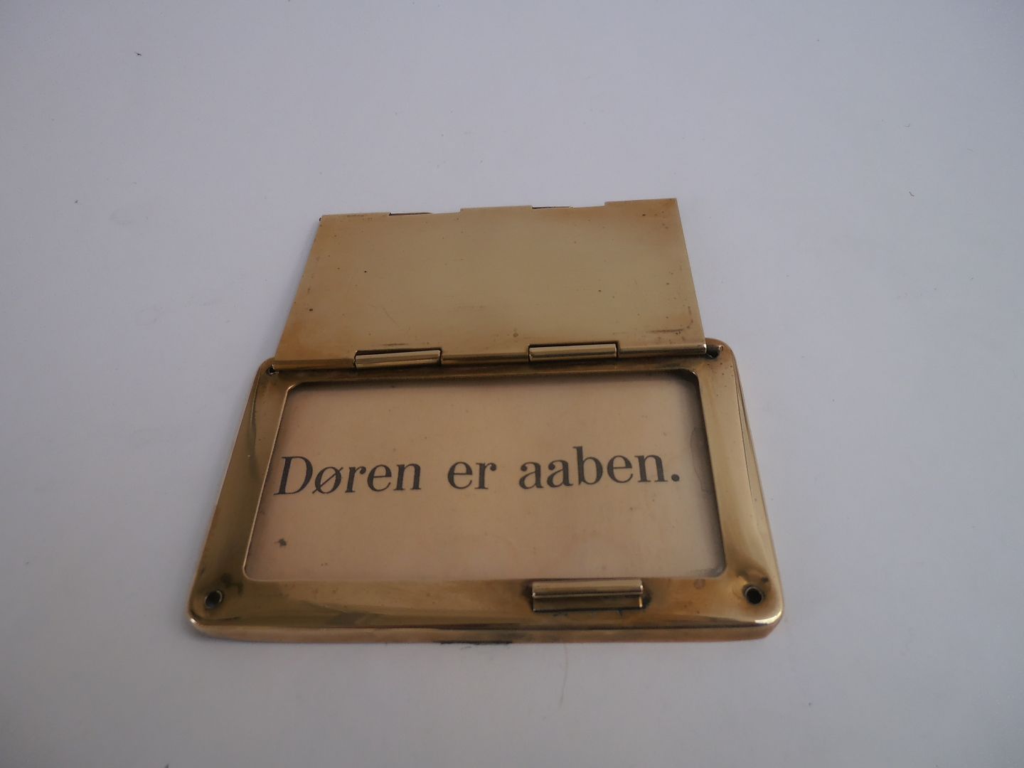 "Døren er aaben" skilt i messing, Danmark ca. 1920.