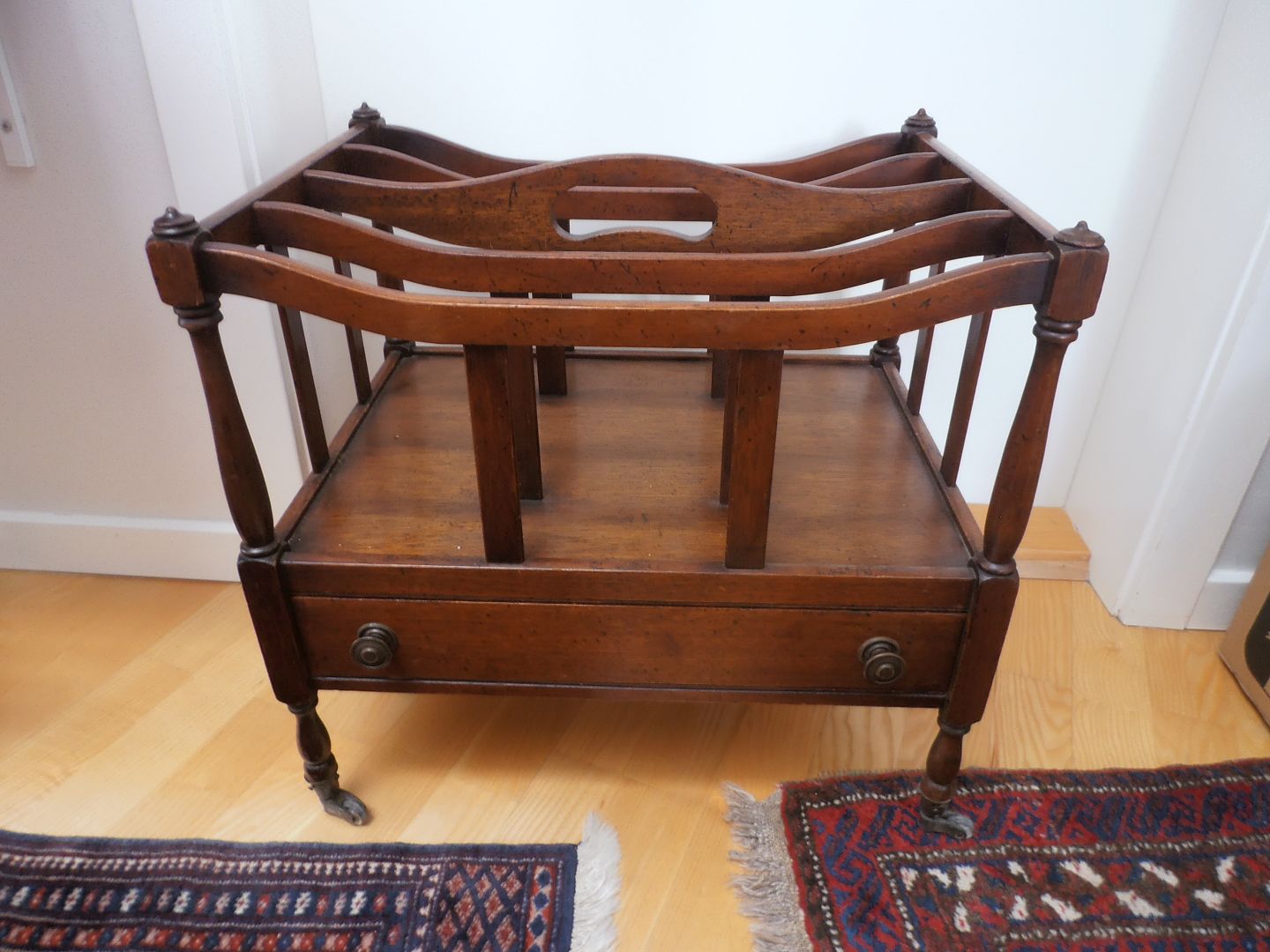 Reproduceret canterburry i Mahogni på hjul og med skuffe, England ca. 1940.