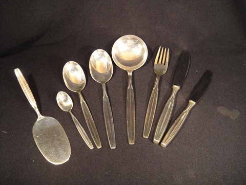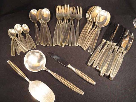9 dinner knives, knife lunch, 12 dinner spoons, seven dessert spoons, 11 dinner forks, 15 tea spoons, potato and butter bread slice.
