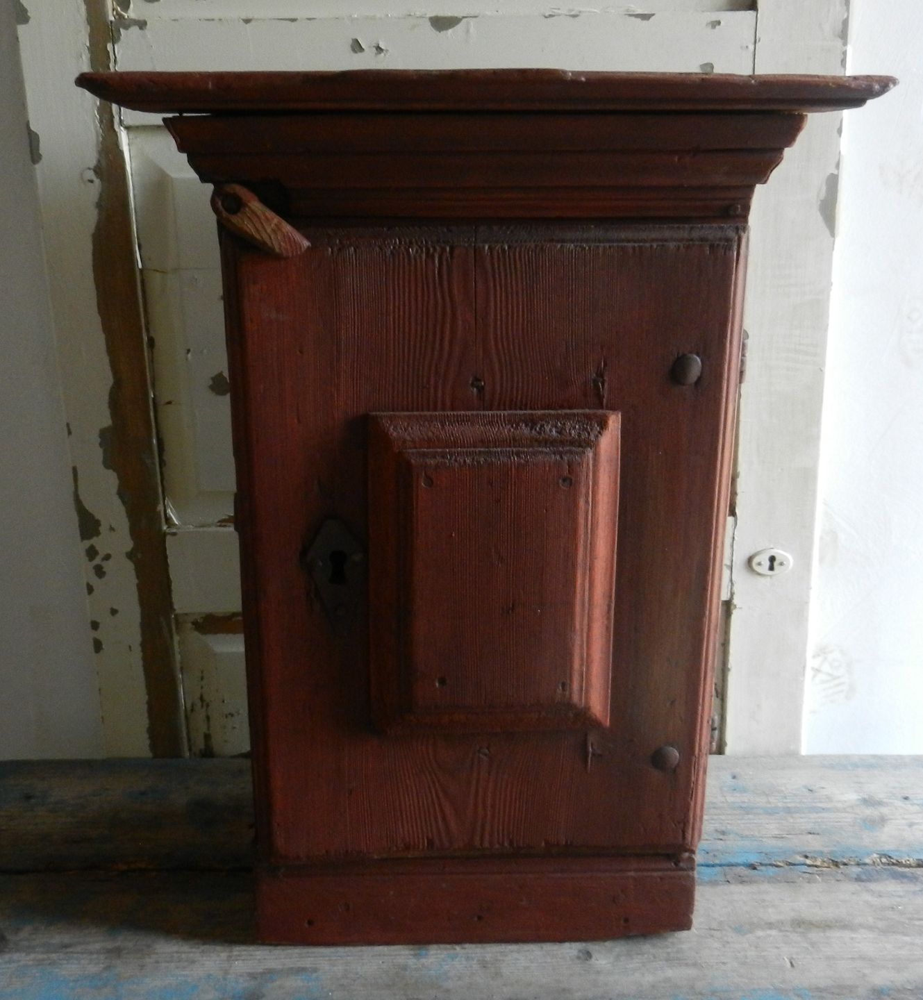 1700tals hængeskab, fremstår med original maling og skøn patina. Låsen mangler!