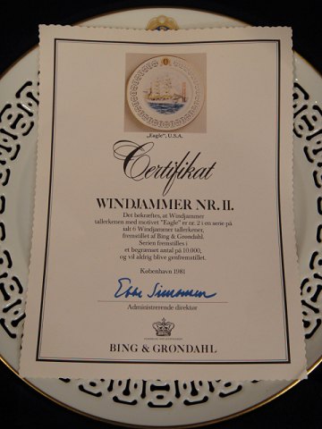 motiv Full-Rigged " Eagle" , U.S.A. er nr. 2 i en serie af 6 stk. windjammer Tallerkner / platte. nr. 8867 /633 Fremstillet af Bing & Grøndahl.