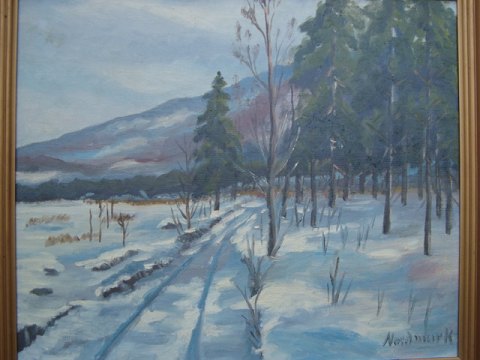 Maleri af ubekendt kunstner - Skovparti, vinter ved Hønefoss, Norge.