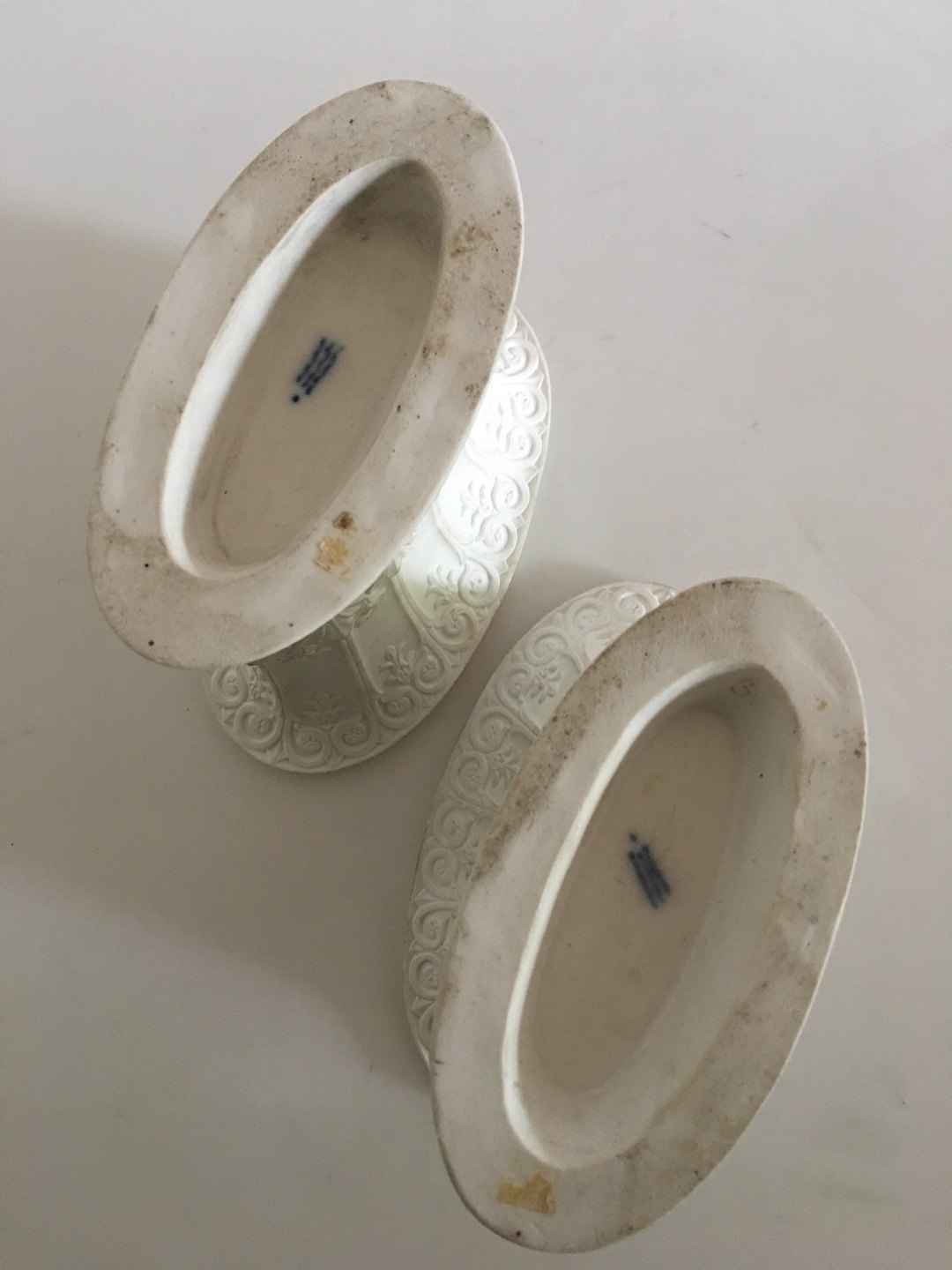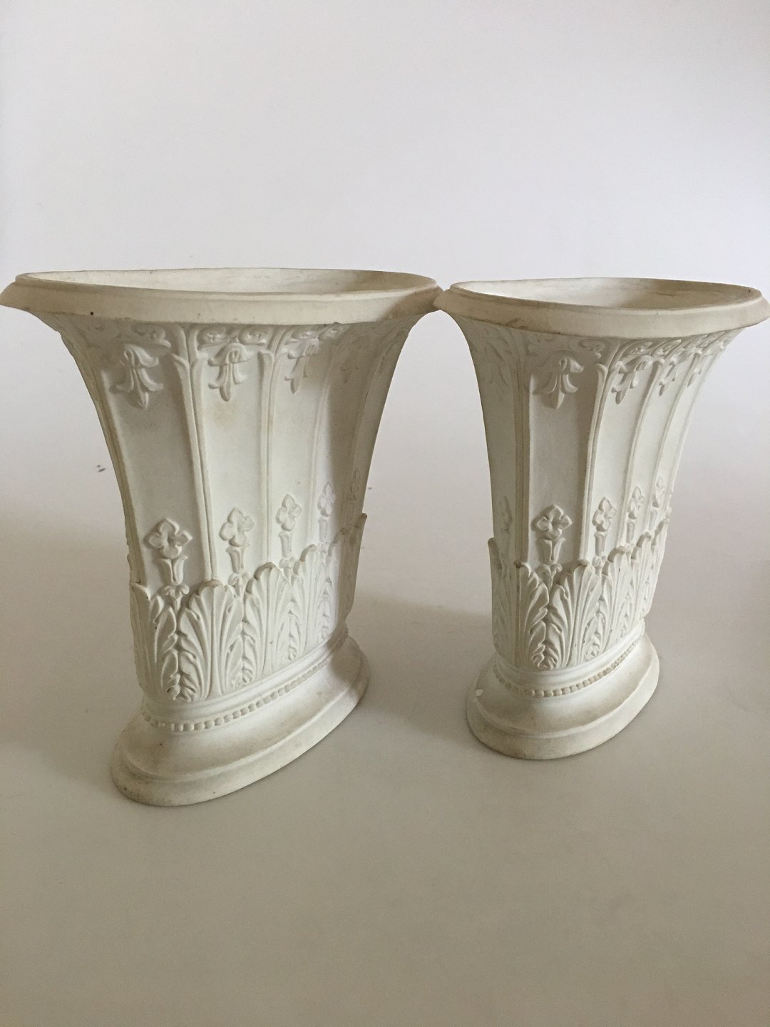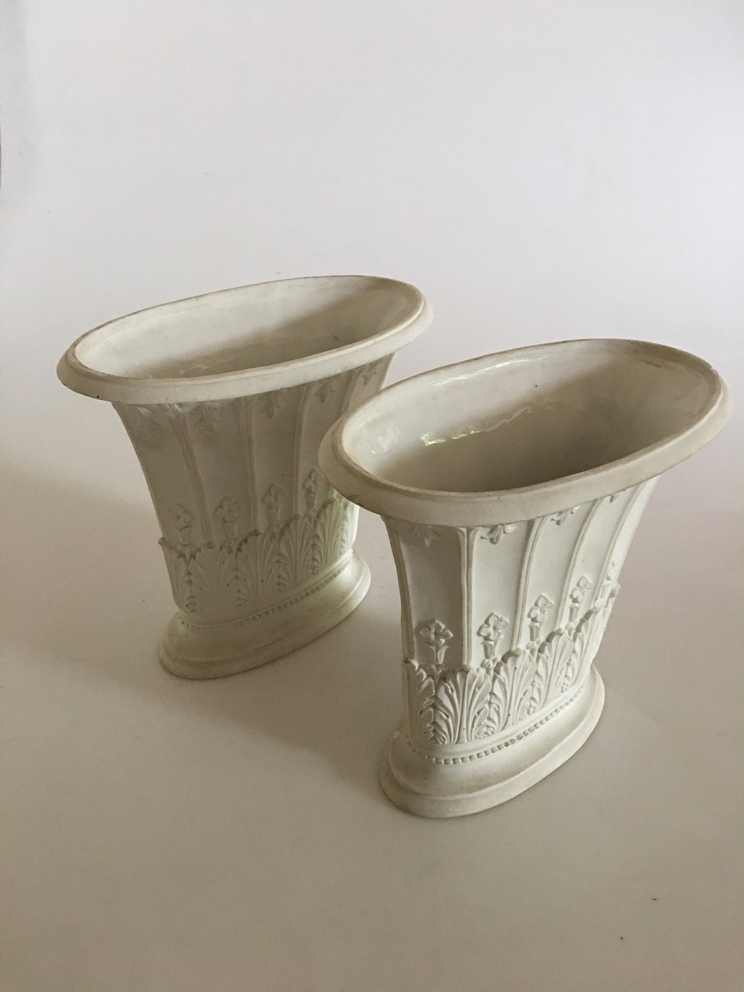 Royal Copenhagen Pair of Empire vases by Hetsch. Measures 6/3/4" tall and 7 3/4" wide. Condition is good, but with a few tiny chips. Glazed inside, but outside of the vase is bisque.