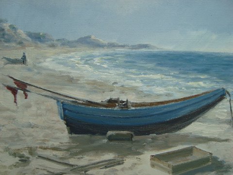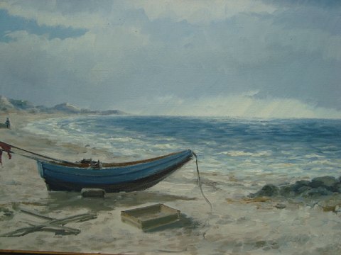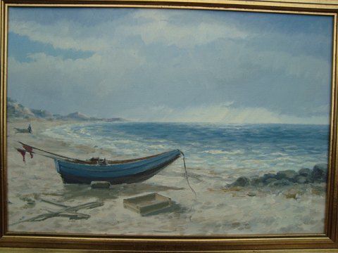 Maleri af E. Thorbjørn - Strandparti med optrukne fiskerbåde.