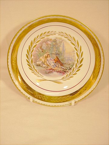Kongeligt Porcelæn. Tallerken med romantisk motiv og guldkant