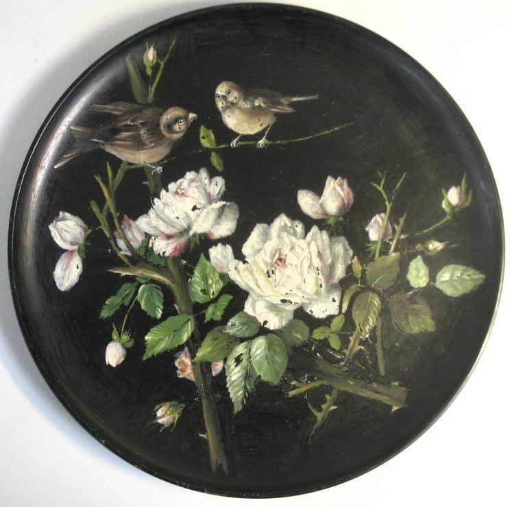 L. Hiorth fad, Bornholm, no. 610. 19. årh. Danmark. Håndmalet med spurve i en rosenbusk. Sort grund. Dia.: 35 cm. Med afskalninger. Ellers flot stand.