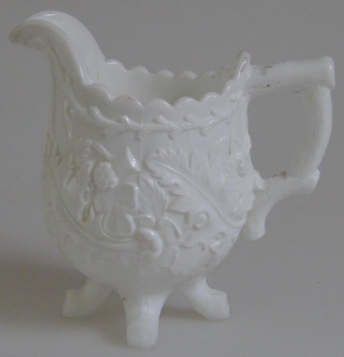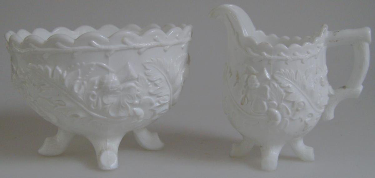 Sugar / cream set, in white pressed glass, with floral decorations. On three legs shaped like branches. Flaked edges and branched handle on the creamer. ca.1900. H: 8.5 - 10.5 cm. Dia. basin: 13 cm.