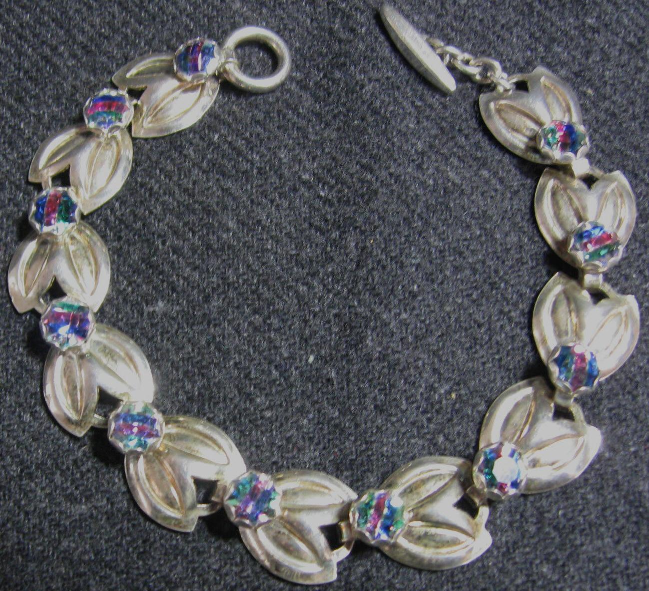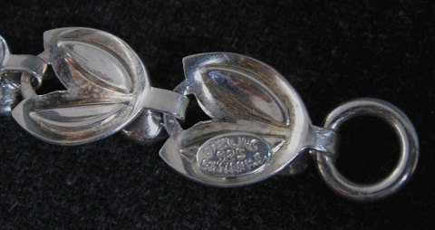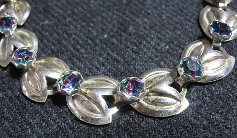 Armbånd i sterling sølv, Danmark, 1960'erne, med blade og farvede glasstene. Længde.: 20 cm. Stemplet: Sterling, Denmark, 925, H.S for Herman Siersbøl, (efter 1948 ) København.