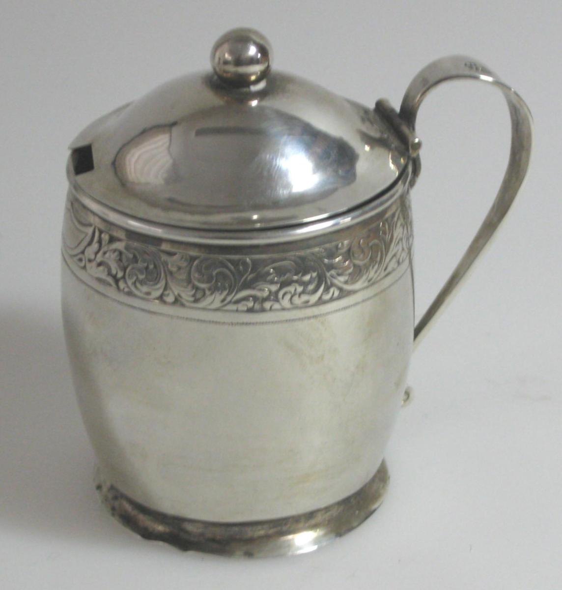 Sennepskrukke i sølv, stemplet København 1814, med mestermærke, Jørgen Hauerberg (1805 - 1842) H.: 9 cm. Vægt.: 84 gram.  Glasskål indvendig mangler.