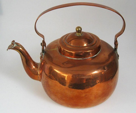 Vand keddel i kobber, Danmark, 19. årh. med hank, låg og tud med lukke. Lågknop af messing. Ustemplet. Højde med hank.: 22 cm. Dia. korpus: 22 cm.