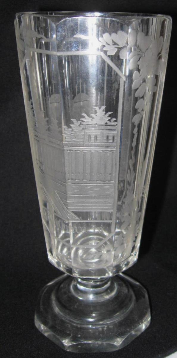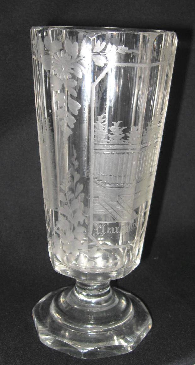 German glass trophy in crystal, 19th century. With octagonal foot and octagonal cup. With floral grinding. Grindings of buildings and landscape. With inscription: Neubrunnen in Karlsbad & Kreuzberg. H: 19 cm.