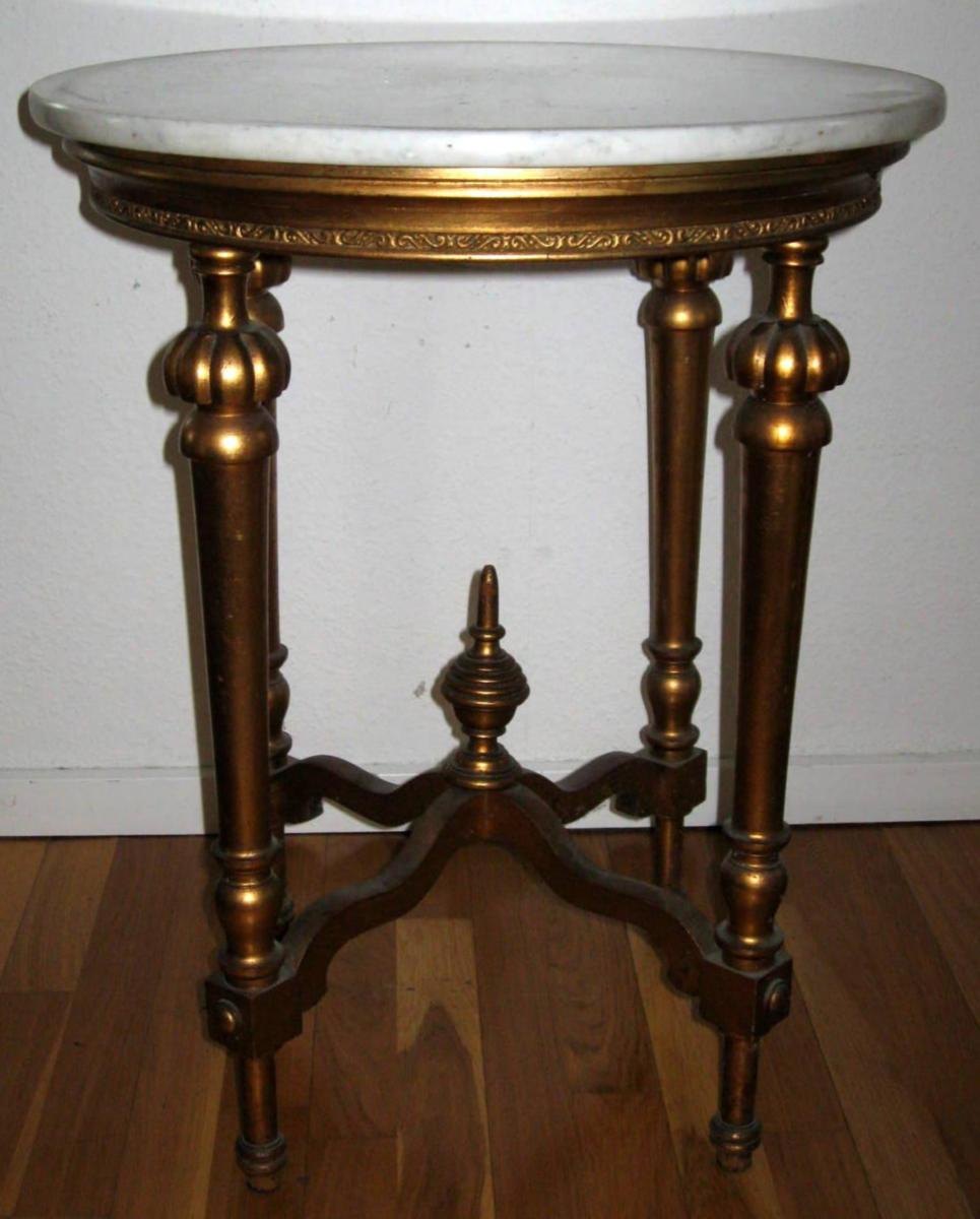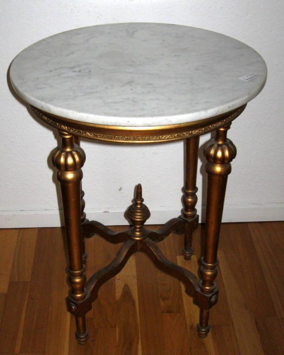 French gilded table with marble plate, 19th century. Twiated legs with decorations. Edge Decoration. H: 72 cm. Dia. plate: 58 cm.