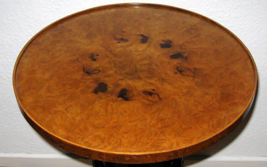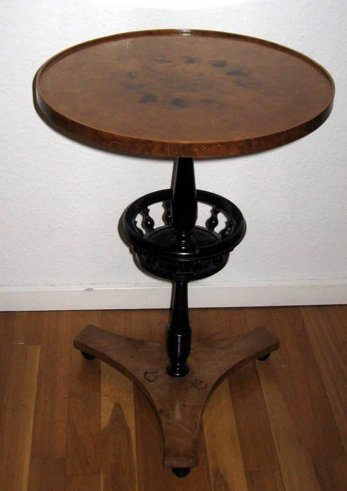 Round table of birch, plate worn by black painted baluster column with basket on three foot. Biedermeierform. 1900s ending. H. 67.5 cm. Diam. 49 cm. Good condition!