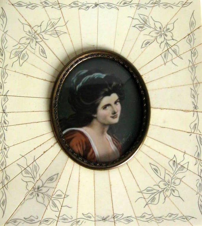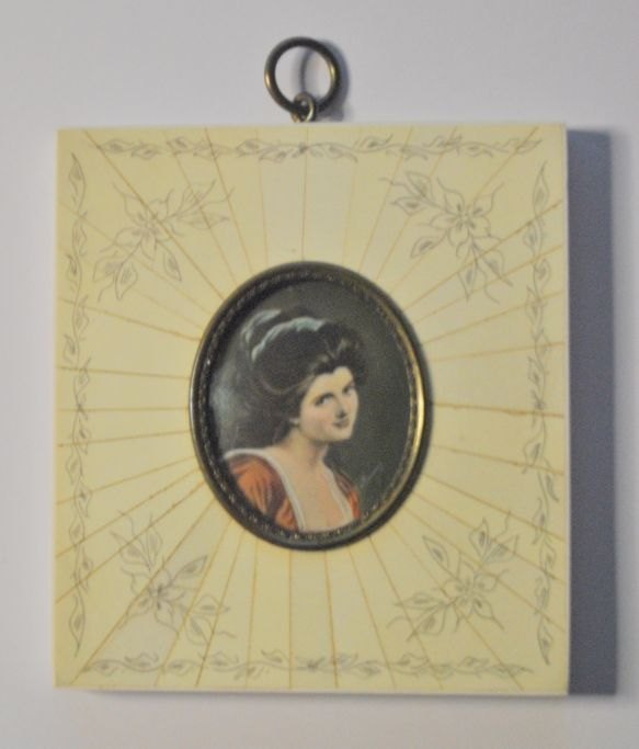Unknown miniature artist, 19/20. year: Portrait of Lady Hamilton. With frame in bone. 10.5 x 9.5 cm. Signed: Romno J.