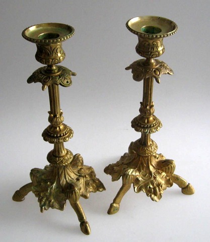Par franske stager i lueforgyldt bronze, 19. årh. Med fod i form af bukkehorn og agern. Profilerede stammer med dekorationer. H.: 25 cm. Flot stand!