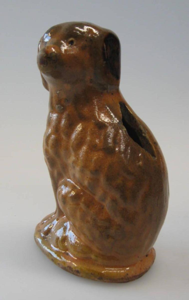 Sparebøsse i ler, Bornhom, 19. årh. I form af en siddende hund. Gulbrun glasur. Med revner - efter forsøg på åbning. H.: 13 cm.