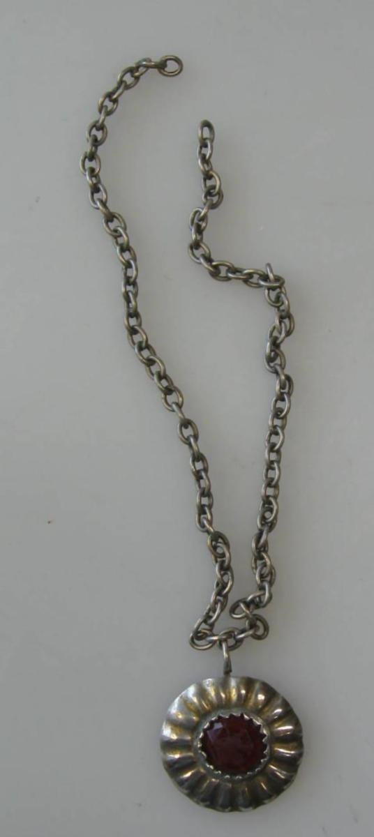 Antique silver pendant with red glasflus, Denmark, 19th century. With silver chain. Dia .: 2.5 cm.