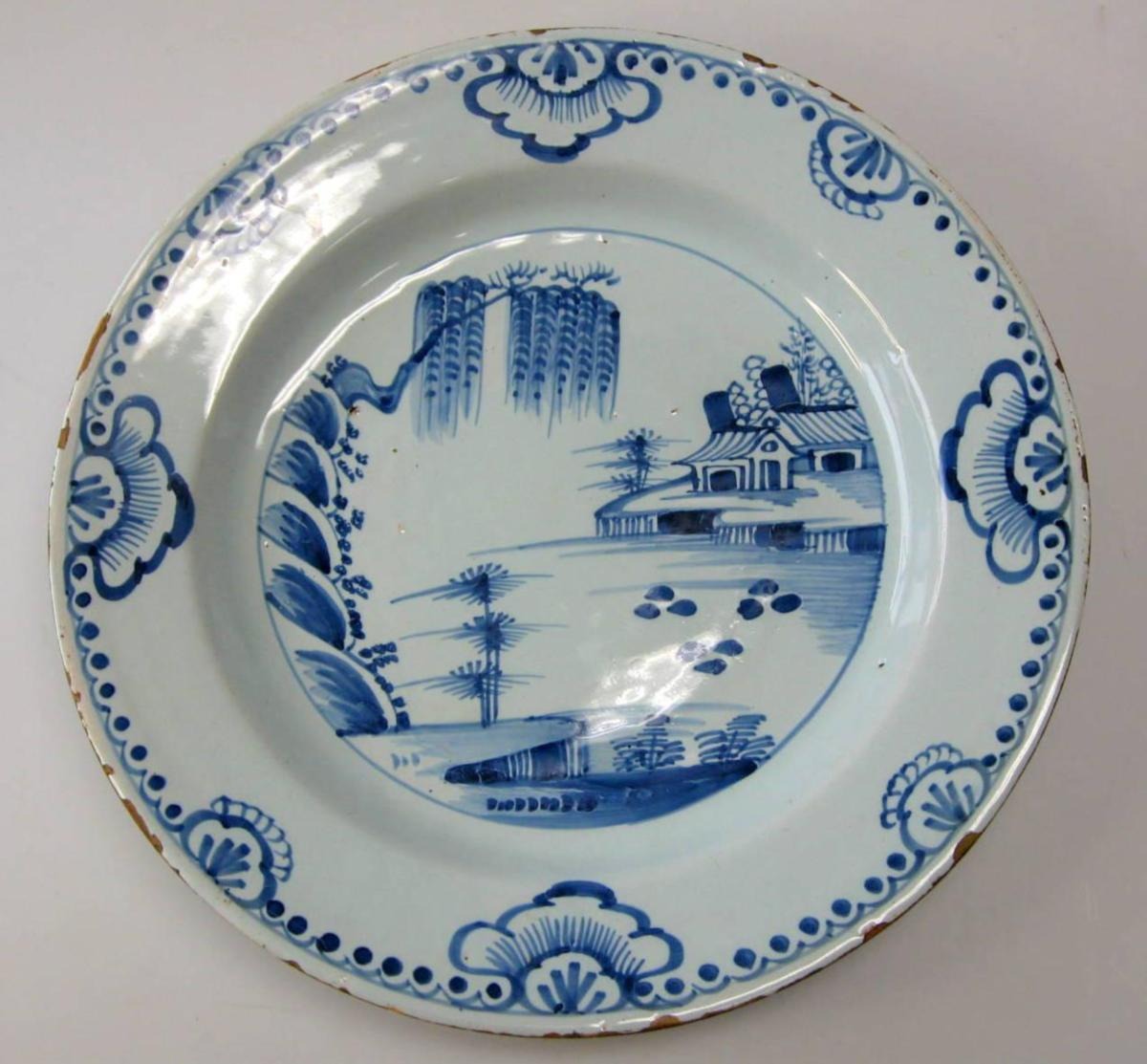 Bristol "Delft" England, 18.årh. 18.årh., Grålig skærv, dekoreret i blåt med landskabs scene. Med små kanthak. dia.: 30 cm. Proveniens.: Antikvitetshandler Santhers, Aarhus. Ekspertice: Lars Topgaard, 31.10.2014.