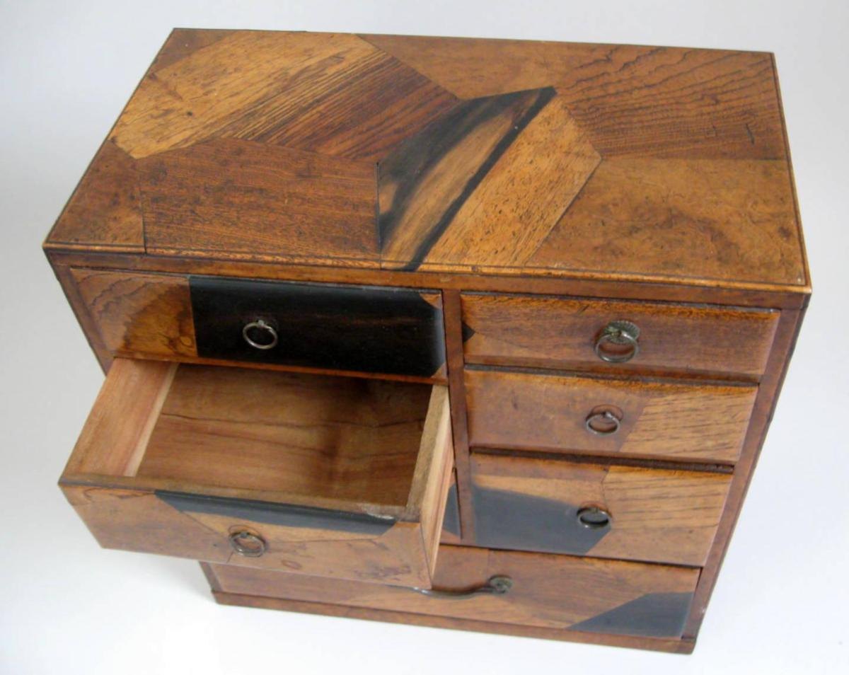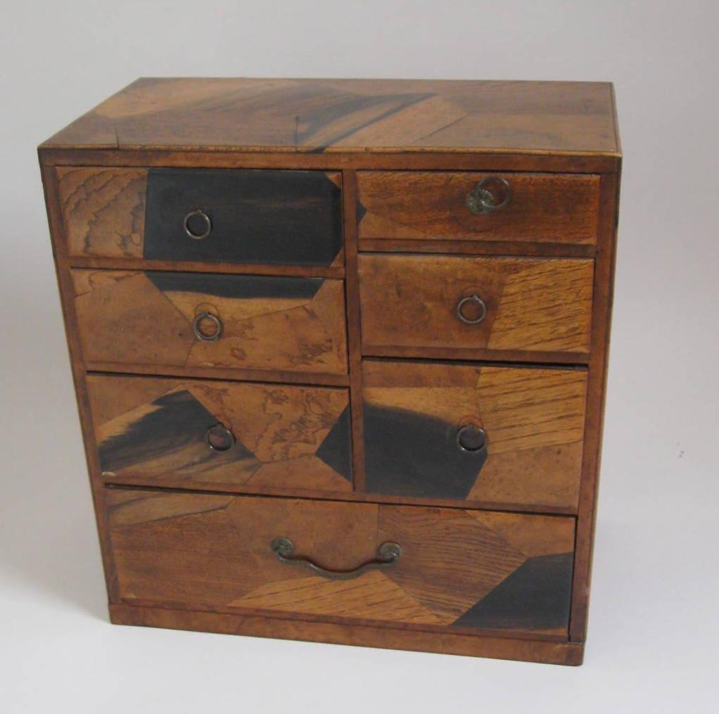 Japansk smykkeskrin, 19. årh. af forskellig farvet træ. Med 7 skuffer. H.: 32 cm. B.: 30 cm. D: 18 cm.