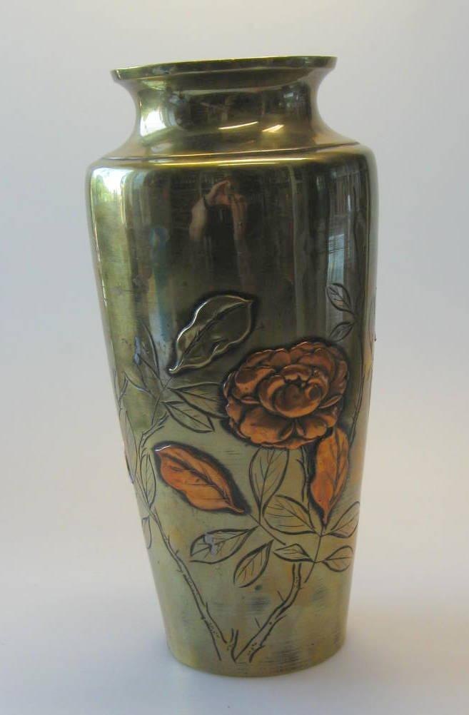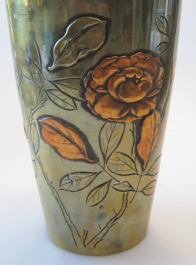 Japanese brass vase with decorations in the form of flowers, c. 1900. Some of the flowers are made of copper. H .: 21 cm.