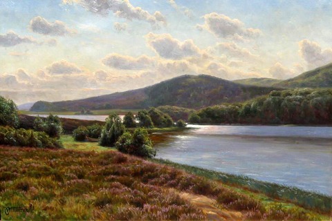 Wennerwald, Emil (1859 - 1934) Danmark: Parti fra Himmelbjerget. Olie på lærred. Signeret.: E. Wennerwald. 47 x 73 cm. Med samtidig forgyldt ramme.
