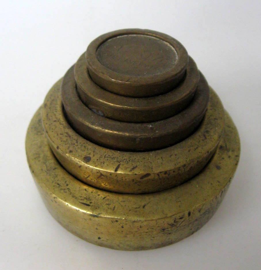 Et sæt engelske messinglodder, 19. årh. 5 stk. Stemplet.: W & T. Avery Ltd.
