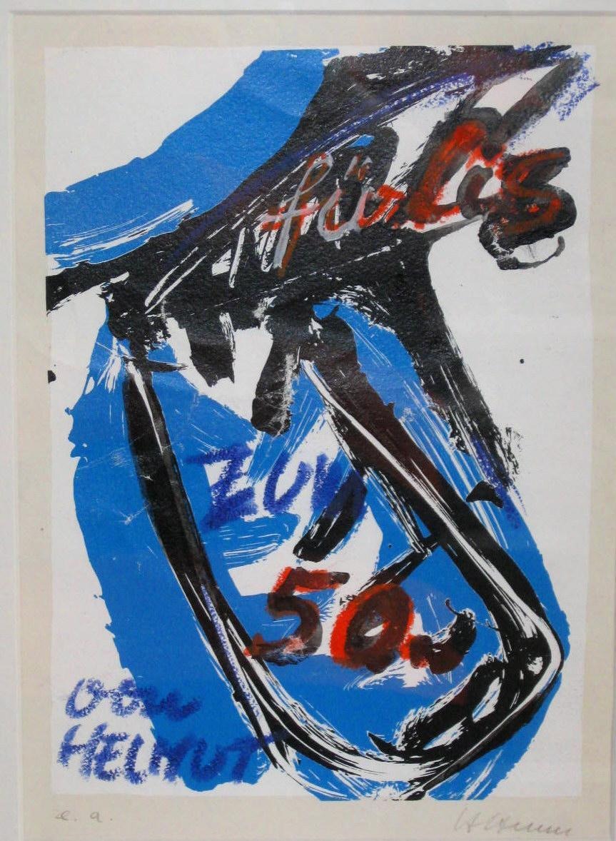 Sturm, Helmut (1932 - ) Tyskland: Komposition. Litografi med pastel. Signeret.: H. Sturm. e.a. 26 x 18 cm. Med dedikation.: Für Lis (Zwick) zum 50- von Helmut. Med sort ramme. Proveniens.: Drakabyggets Kunstsamling.