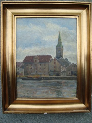 Maleri af Hjalmar Storm - Parti fra Christianshavn med Christians Kirke i baggrunden.
