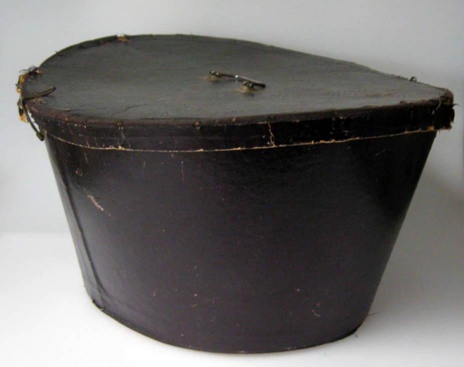 Høj hat i mulvarpeskind med tilhørende æske og sorte handsker. 19. årh. Hatten er af engelsk fabrikat. Indvendig med silkeog kant i læder. Med stempel. Indvendig mål: L.: 20 cm. B.: 16,5 cm. Æske i sort pap med hængsler og hank i metal.