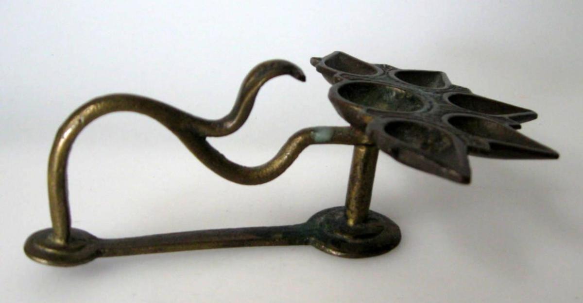 Indian bronze oil lamp, 19th century. Handles shaped like a cobra snake. 5 tulip shaped holes and 1 round for wick. L .: 12.5 cm. B .: 8.5 cm. H: 4.8 cm.