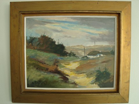 Maleri - Knud Bøstrup - Klitparti med graner og gård.