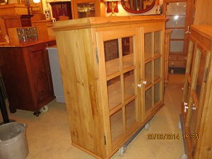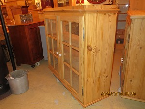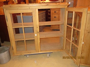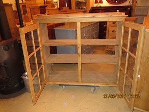 Køkkenskab / Vitrineskab afsyret fyrretræ med 2 glaslåger Restaureret Originalt skab mål B 116, D 39, H 100,cm. 469/474-x Kan males efter ønske.