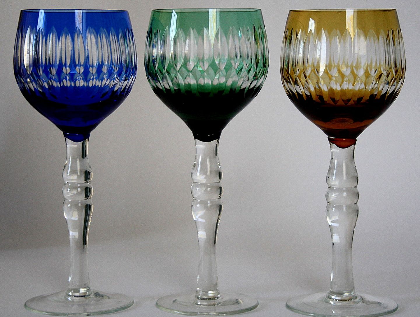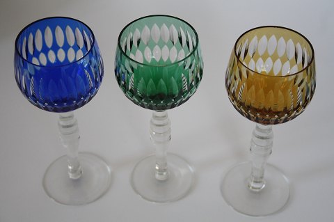 Bøhmiske krystalglas i 3 farver, højde 18,5 cm. Pris 150 kr. stk.