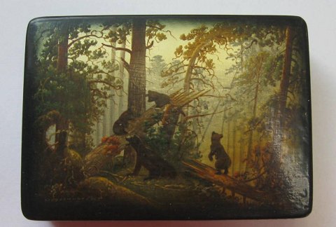 Russian lacquer, 20th century. Hand painted. Decorated with bears in the forest.
