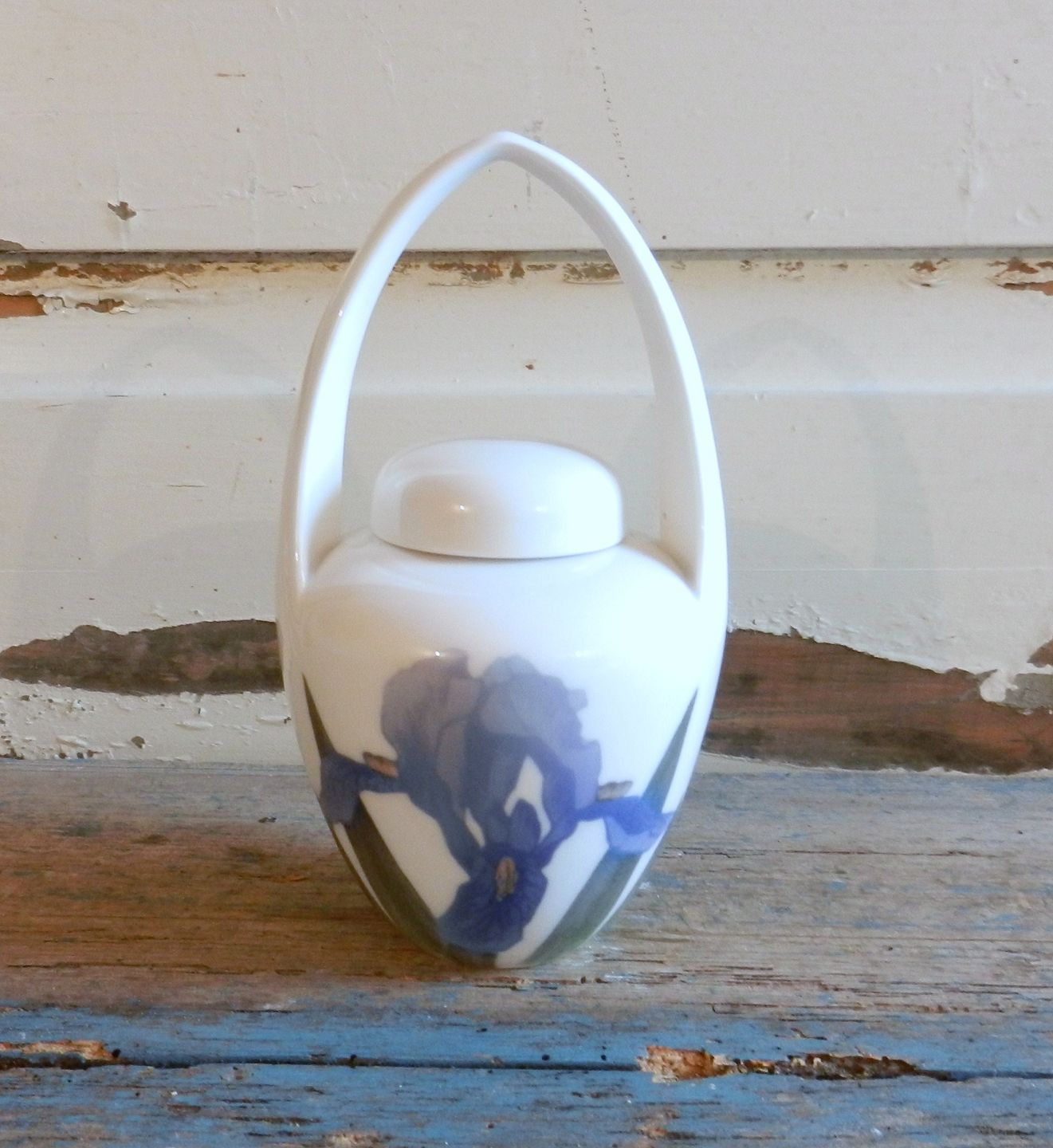 Royal Copenhagen Art Nouveau lågvase med hank, smukt dekoreret med blå iris.